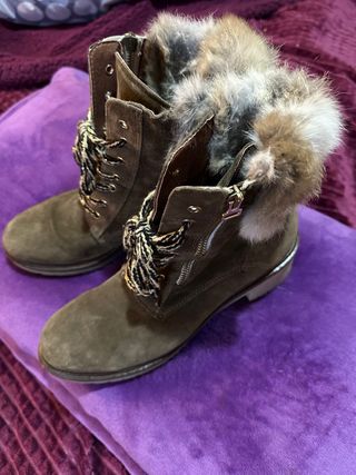 Botas de mujer con forro interior de pelo y detalle de lazo. - Exterior de ante sintético. - Ojales metálicos para cordones. - Suela de goma. Están prácticamente nuevos, los vendo porque son demasiado planas. Se parecen a las míticas Hugg. Súper calientes, ideal frío, nieve, invierno. Dispongo de otras igual en color dorado o camel.