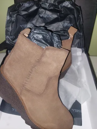 Botines de cuña para señora de la marca Carmela. - Color marrón. - Diseño moderno y elegante. - Material Ante