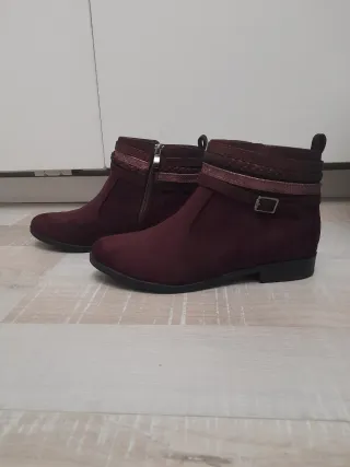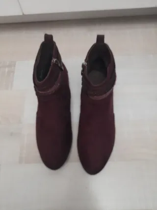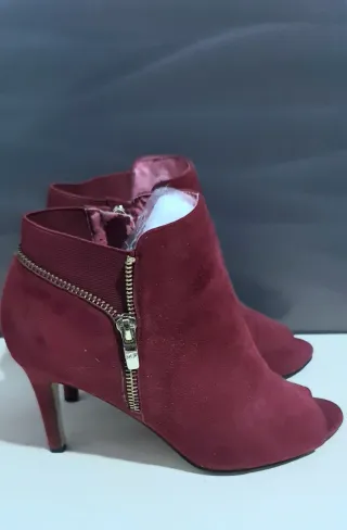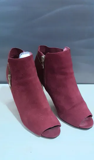 Botines de ante en color bordeo con cremallera lateral dorada y puntera abierta. - Material: Ante - Color: bordeo - Cierre: Cremallera lateral - Diseño: Puntera abierta (peep toe) Están en perfectas condiciones solo por dentro se han pelado (última foto)