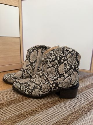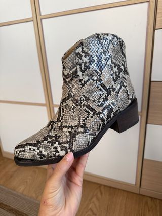 Botines de estilo cowboy con un llamativo estampado de serpiente. Un calzado versátil y moderno. - Diseño de caña corta. - Tacón bajo y cómodo. - Puntera cuadrada.