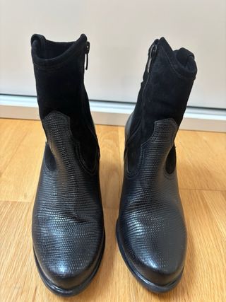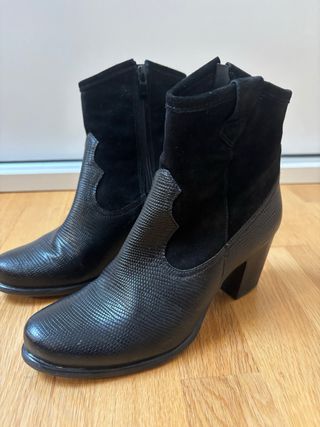 Botines de tacón para mujer. - Diseño de punta afilada. - Detalle de hebilla y ojales metálicos. - Cremallera lateral para facilitar el calce. -Son 38 pero sirven más para 37- 37 1/2 o 38 con pies delgados porque la punta es fina y se angosta los zapatos. - casi nuevos