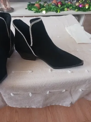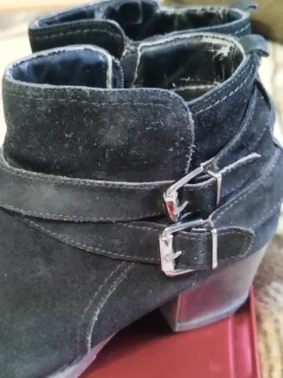 Elegantes botines de ante con un diseño cruzado y detalle de hebilla dorada. - Material exterior de ante. - Detalle de hebilla metálica dorada. - Tacón grueso para mayor comodidad de unos 7,5 cm. - Tapas y suela cambiadas antideslizantes. - Talla 38.
