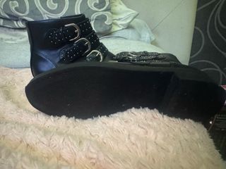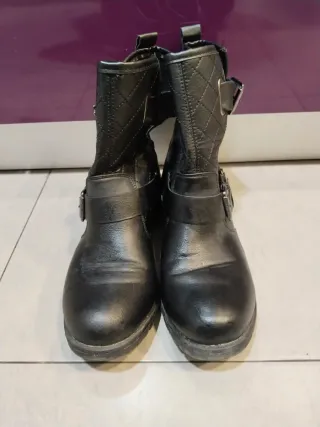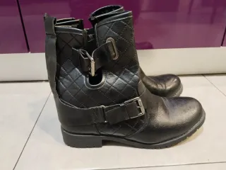 Botines negros con un diseño acolchado y detalles de hebillas. - Caso sin uso como se ve en el desgaste de la suela - Cierre con cremallera lateral. - Detalle de hebillas decorativas.