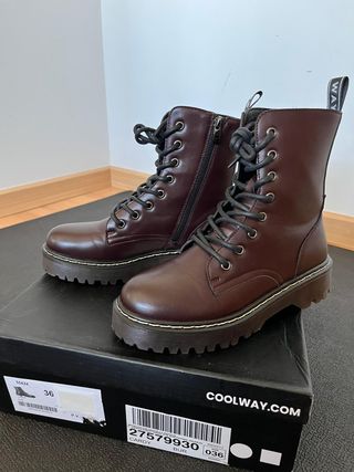 Botines Coolway Cardy en color burdeos, talla 36 (talla grande, mi talla habitual suele ser la 37). Suela chunky con buen agarre, cremallera lateral y cordones ajustables. Están sin estrenar. Incluyen caja original.