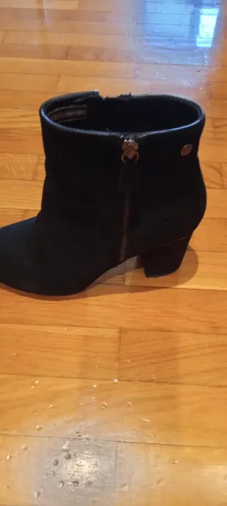 Botines de tacón alto de ante negro, con un diseño moderno y elegante. Están sin estrenar. Preciosos. Los tengo en mi perfil iguales en marrón. Oferta si te llevas los dos pares - Material exterior de ante. - Cierre lateral con cremallera. - Detalle de cordones en la parte trasera. - Tacón grueso para mayor comodidad.