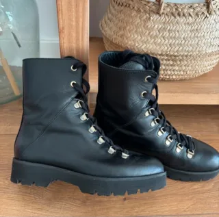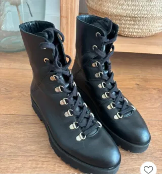 Botines de cuero con cordones y cremallera lateral. Chulos, cómodos. Puesto par de veces. Ya no puedo usar tacones. - Diseño de caña media. - Tacón grueso y suela track. - Detalle de cordones en la parte delantera.