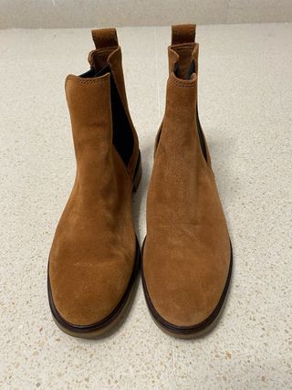 Botines estilo Chelsea de la marca Sandro. - Material exterior de ante. Piel. - Detalle metálico en la puntera. - Suela gruesa con relieve. En buen estado. Tienen manchas negras en la piel un poco. La plantilla tiene 25 cm
