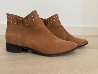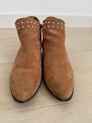 Botines de la marca Sfera en color marrón. - Diseño con tachuelas decorativas. - Cierre de cremallera lateral. - Tacón bajo y cómodo.