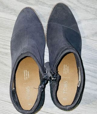 Botines de ante, color azul , llevan cremallera a los lados y acabados en flecos. Tacòn de suela de tocino, ancho y còmodo. Están en perfecto estado, muy poco uso.