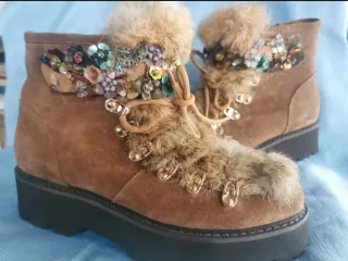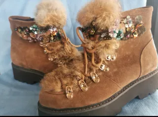 Botines de ante de la marca Alma en Pena. - Color marrón con detalles multicolor. - Adornados con pedrería y abalorios. - detalles de pelo. - Suela gruesa y resistente. Usados en una ocasión. Se ha perdido alguna flor
