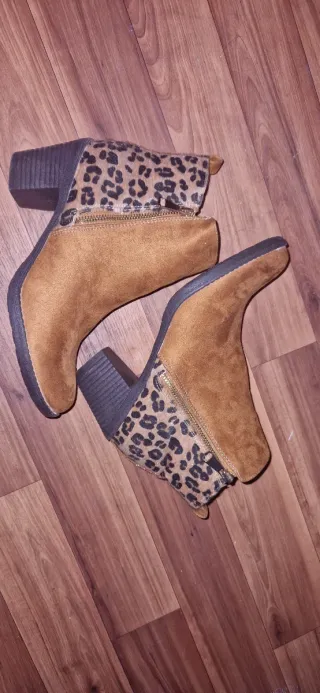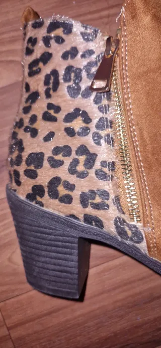 Botines de estilo moderno con un toque salvaje. - Diseño con estampado de leopardo. - Tacón grueso para mayor comodidad. - Cierre de cremallera lateral.