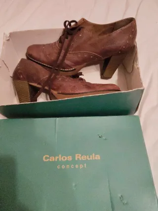 Elegantes botines de la marca Carlos Reula en color marrón. - Diseño con detalle de perforaciones. - Tacón cuadrado y robusto. - Cierre con tiras.