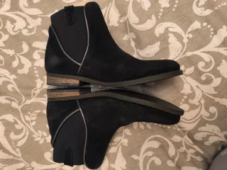 Botines negros, elásticos, con suela y tacón de goma, altura media. Cómodos, ligeros, juveniles, actuales, muy ponibles de sport o vestir. Daniela&Vega Talla 36, fabricados en España Tienen 2-3 usos, no se pueden usar por ser pequeños, la suela se ve nueva prácticamente Comprados el invierno pasado por 69€, se dejan a menos de la mitad de precio, una oportunidad Mejor ver y probar, sin compromiso, si te gustan, valen e interesan podemos hablar algo del precio