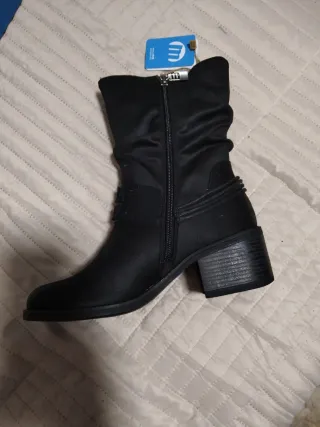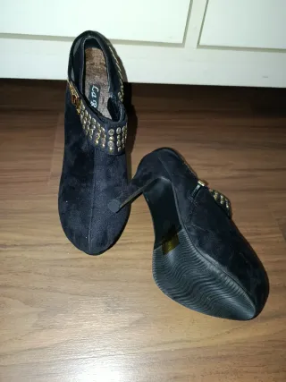 Tipo ante, con elásticos laterales para ajustarlo en el tobillo. Tacón ancho de 9cm. Poco uso. Talla 39. Precio original 30€.