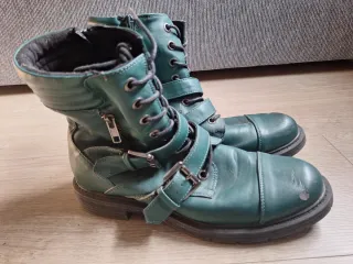 Botines de estilo motero en un llamativo color verde azulado. Perfectos para añadir un toque audaz a cualquier atuendo. - Diseño con cordones y hebillas ajustables. - Cremallera lateral para facilitar su uso. - Acabado sintético. - Suela de goma resistente.