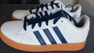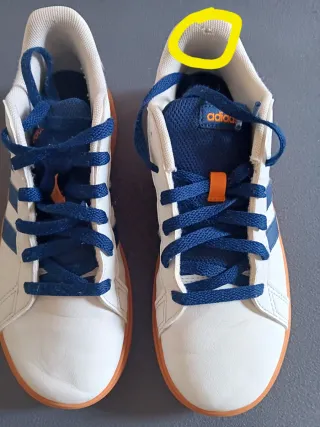 Botines deportivos Adidas con un diseño clásico y moderno. - Un par de puestas muy nuevo. - Exterior blanco con detalles en azul. - Suela de goma en color caramelo. - Cordones azules. - EN FOTO SEÑALO EL FALLO QUE TIENE.