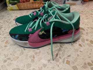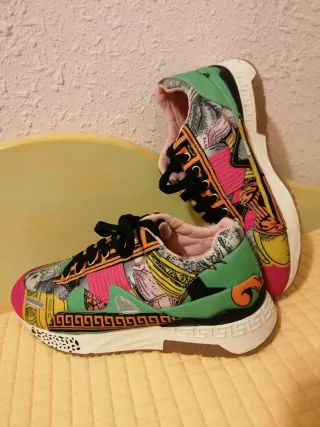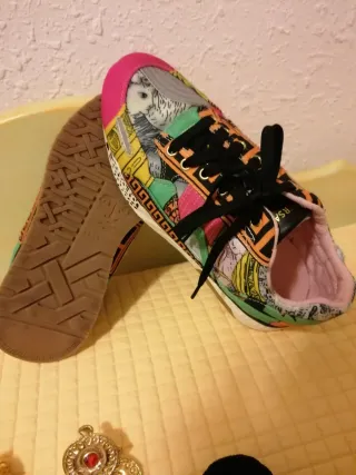 Botines deportivos con un diseño vibrante y muy poco uso. - Estampado artístico llamativo. - Cierre con cordones negros. - Interior forrado en rosa. - Suela de goma con patrón de agarre.