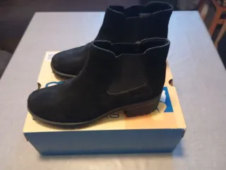 Botines de mujer en color negro. - Material exterior de ante. - Diseño tipo chelsea con elásticos laterales. - Tacón bajo y cómodo. Talla 40 marca unit comprado en Hipercor no tienen uso