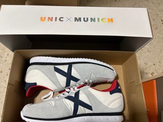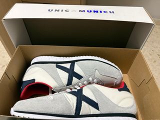 ESCUCHO OFERTAS POR ESO EL PRECIO Zapatillas Munich de estilo deportivo, talla 40. - 1 solo uso - Combinación de colores gris y blanco. - Diseño con detalles en azul marino y rojo.