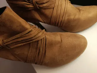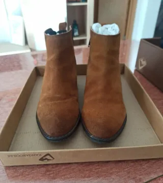 Botines de tacón en color marrón. - Diseño tipo chelsea. - Material efecto ante. - Tacón grueso. Como podeis apreciar el zapato esta como si fuera nuevo, la suela practicamente intacta. Muy poco uso porque al nada de comprarlas me pusieron plantilla.