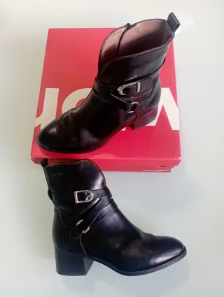 Botines de alta calidad, cuero ó piel natural en color negro. Marca Wonders fabricación española, se entregan en su caja original. Talla o número 36. - Tacón cuadrado de altura media. - Detalle de cremallera lateral. Un solo día de uso, están impecables.