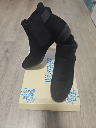 Preciosos botines de ante en color negro, ajustados al tobillo y con un poquito de tacón. También tienen una hebilla decorativa en el lateral. Son muy cómodos. Talla 36.