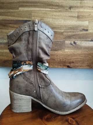 Botines de tacos fino,de unos 10 Cm,y plataforma de 4.Color marrón sucio,calados en los laterales y pequeña apertura delantera.Marca María mare,número 38
