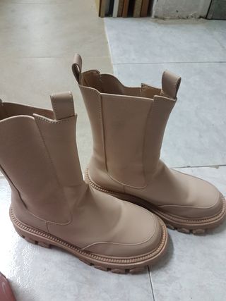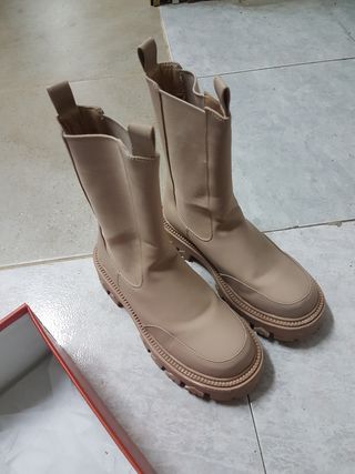 botines talla 35 color Camel de piel vuelta. Cierre mediante cremallera interior+ cremallera exterior decorativa