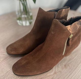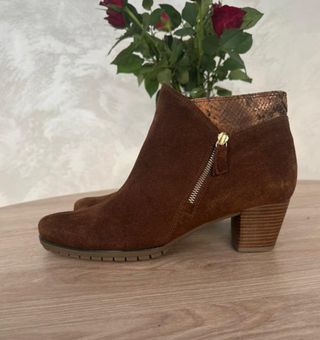 Botines de ante en color marrón con detalles dorados. Piel auténtica. Talla 9,5 - Cierre de cremallera lateral. - Tacón de bloque. - Detalle de estampado de serpiente en la parte trasera. Hago lotes