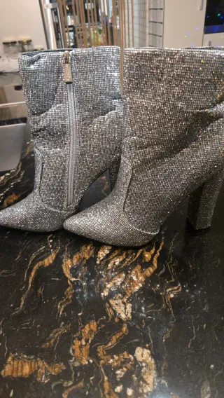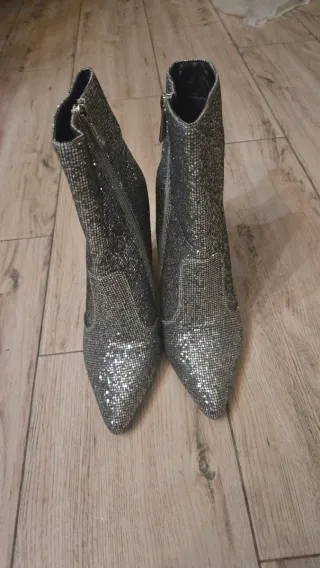 Botines de tacón alto con un acabado brillante que capta la luz. Perfectos para añadir un toque de glamour a cualquier atuendo. - Diseño con cremallera lateral. - Punta afilada. - Tacón grueso y estable.