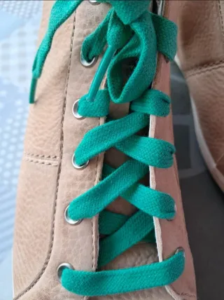 Botines de piel, color beig/camel, de Timberland. Talla 39 Cordones verdes pero con cordones de recambio color beig. Cremallera lateral con detalle en el cierre. Sin estrenar