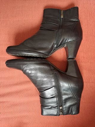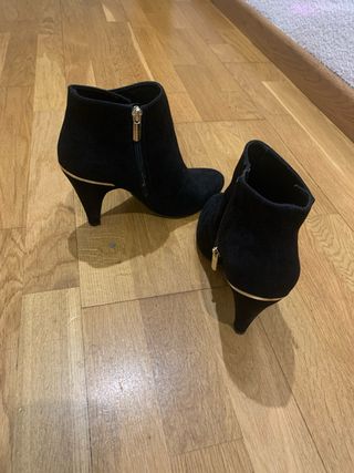 Botines de tacón alto y semi-ancho con un diseño elegante. Muy cómodos de llevar y de poner, gracias a la goma ancha en los tobillos. Usados apenas 3-4 veces. - Material exterior tipo ante. - Detalle elástico en los laterales. - Adorno metálico dorado en el tacón. - Punta fina.