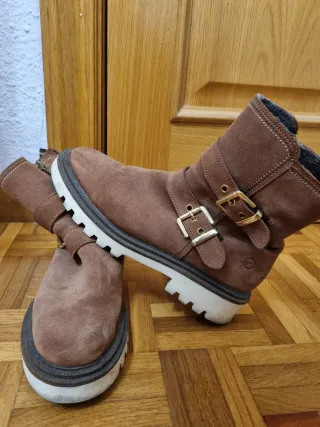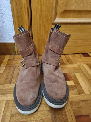 Botines de ante en color marrón. - Cierre con cremallera lateral. - Detalle de hebillas y tiras. - Tirador trasero para facilitar el calce. - Suela gruesa y cómoda. Muy poco uso