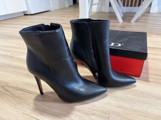 Botines negros con un toque elegante. - Tacón con detalle dorado. - Cierre de cremallera lateral. - Usados en dos ocasiones están perfectos lo único que la solapa de la cremallera interior está un poco desgastada de estar guardados pero ni se ve y están perfectos