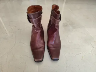 Botines de piel en color marrón, talla 38. - Diseño con cremallera lateral. - Detalle de hebilla decorativa. - Punta cuadrada. Las puntas están un poco desgastadas como se puede apreciar en las fotos.