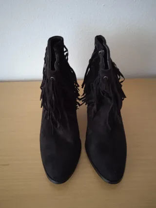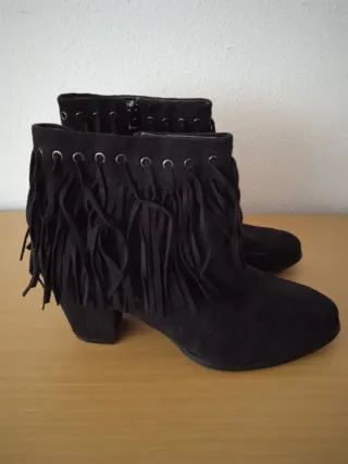 Botines de tacón para mujer con un diseño moderno y elegante. Cuentan con una cremallera lateral para facilitar su uso y un detalle de flecos. Prácticamente nuevos, llevan aún la pegatina del precio original de 49,99€. - Tacón grueso para mayor comodidad. - Material exterior: piel sintética. - Cierre de cremallera lateral.