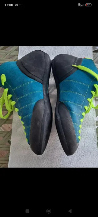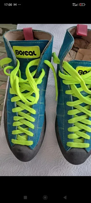 Botin de escalada clásicas de la marca Boreal. Diseñadas para ofrecer un buen agarre y comodidad. Talla 39'5 - Color azul con cordones verdes. - Cierre con cordones. - Diseño de caña alta. -suela origal boreal rigida #escalada #piedegato #boreal