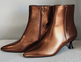 Botines a estrenar con acabado metalizado en oro viejo y efecto piel de cocodrilo. Un modelo cómodo y funcional con un color que marca la diferencia. Talla 38 Nuevos Tacón bajo 5,5 cm Cuero sintético Elegantes, cómodos y fáciles de combinar. ¡Listos para estrenar! Precio ya ajustado