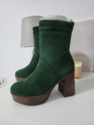 Botines de ante con un diseño moderno y llamativo. Tallas 38, 41 - Material exterior de ante. - Tacón grueso y plataforma. - Caña media. Plataforma delantera de 3,5cm y Tacón de 8cm