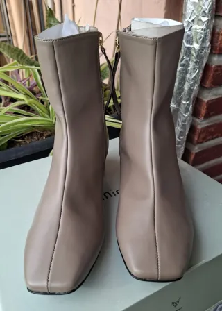 Botines veganos de la marca Urbanima en color taupe. - Diseño moderno y versátil. - Cierre de cremallera lateral. - Punta cuadrada. - Tacón bajo. NUEVOS