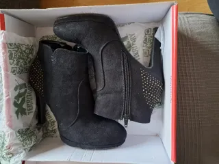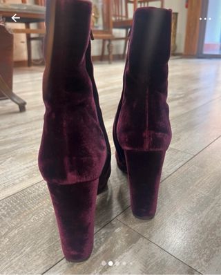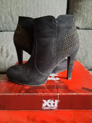 Botines de fiesta con un diseño elegante y llamativo. Poco uso. - Acabado en ante. - Detalle de tachuelas doradas en la parte trasera. - Tacón alto y plataforma por lo que son cómodos de llevar