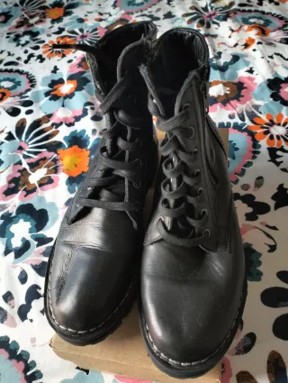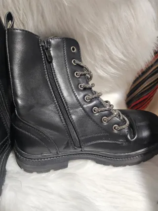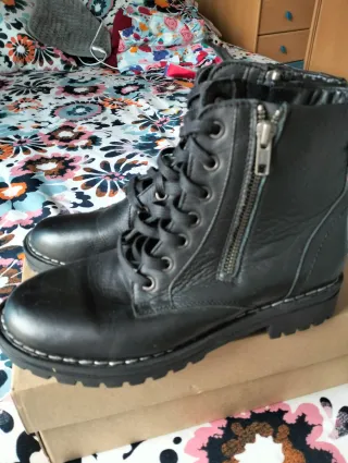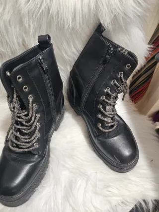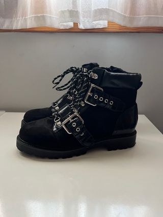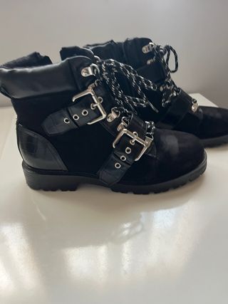 Botines estilo motero con cordones. - Detalle de hebillas metálicas. - Acabado en ante. - Ribete efecto piel de cocodrilo. Estilo motero. Número 39. Ante negro Negros con detalles en plateado, hebillas y parte trasera Solo los he usado una vez pero tienen algún roce no muy apreciable (fotos).La suela incluso conserva las pegatinas Los compré en asos y el precio original eran 50€. Negociable