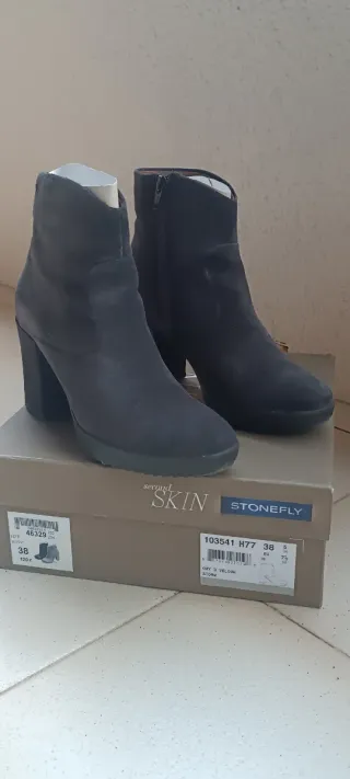 Botines de la marca Stonefly en color gris oscuro. - Diseño moderno con tacón ancho. - Cierre de cremallera lateral. - Material exterior de ante. - Muy cómodos. - Como nuevos, muy poco uso.