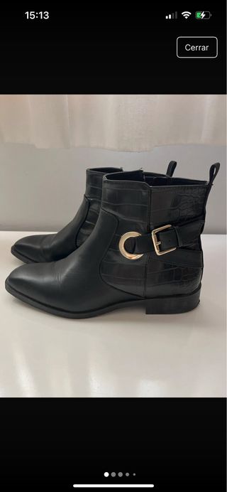 Botines planos con detalle de hebilla dorada. - Diseño con textura de cocodrilo. - Cierre lateral. - Puntera redonda. Número 38. Botines planos negros Se ha usado tan solo en dos o tres ocasiones porque me quedan pequeños La hebilla y los detalles metálicos son en plateado Estado tal cual se ven en las fotos