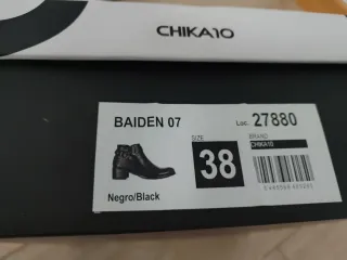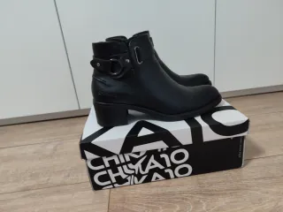 Botines de la marca Chika10 en color negro. Un básico para tu armario. - Diseño moderno y versátil. - Cierre lateral con cremallera. - Detalle de hebilla. - Tacón cómodo. En perfecto estado, apenas usados.