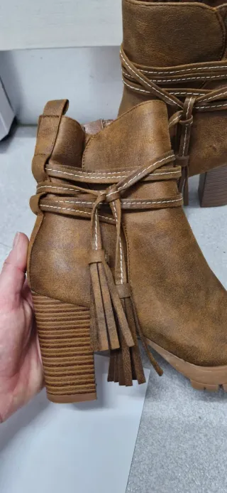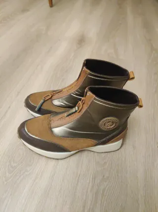Botines de mujer en color marrón y dorado, talla 40. Han sido usados solo dos días. Costaron 99 euros - Diseño moderno con cremallera frontal. - De piel - Suela cómoda.