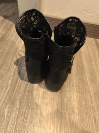 Botines negros con un diseño moderno y detalles de encaje. Usado un par de veces - Parte superior de cuero sintético. - Detalle de encaje en la caña. - Adornos metálicos en la correa. - Cierre de cremallera lateral. Trato en mano en Zaragoza No hago envios