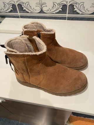 Botines negros con borrego en el interior. Son cómodos y se pueden subir. - Diseño con borrego interior. - Caña alta que se puede doblar. Se levanta la solapa para proteger los tobillos Muy cómodos por el tipo de suela que tienen y poco tacón Muy suaves y calentitos.