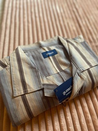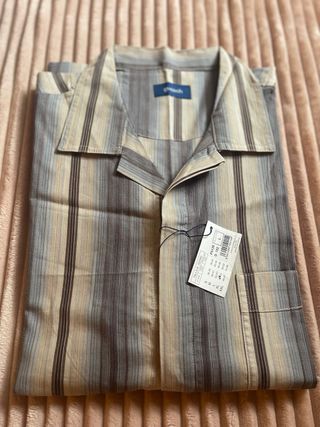 Pijama de la marca Guasch con un diseño de rayas verticales. Confeccionado en algodón para mayor comodidad. - Fabricación nacional - Estampado de rayas en tonos beige y marrón. - Cuello camisero.