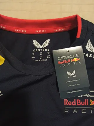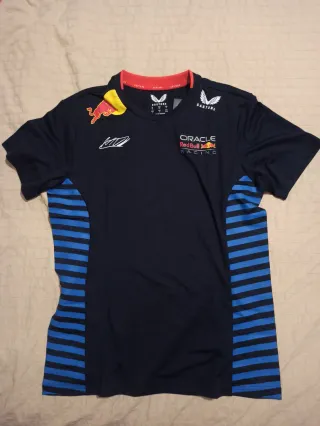 Camiseta oficial de Red Bull Racing para mujer. - Diseño en color negro con detalles en azul. - Logo de Red Bull Racing en el pecho. - Cuello redondo y mangas cortas.